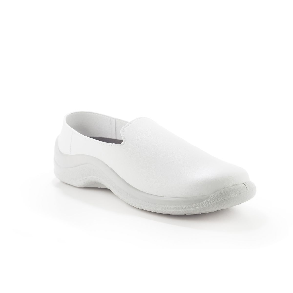 Calzado ligero, flexible, lavable y de mucha duración, derivado del sistema de fabricación por inyección directa, no hay cosidos ni pegados en la unión corte/piso, el zapato es una sola pieza. Piso antideslizante. Horma Unisex, facilita el apoyo del pie sin comprimirlo. El quiebre de horma permite un reparto equilibrado del peso del cuerpo. Certificado según norma EN ISO 20347.
